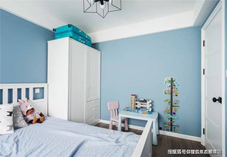 ▲ 儿童房同样也是蓝白的搭配,配合一张小书桌和墙面身高贴,简单的布置也充满了实用和妙趣。