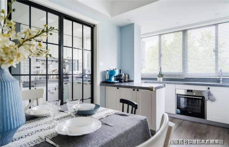 ▲ 餐厅与厨房以格子玻璃门相隔,配合一面黑板墙,通透之余不乏时尚趣味。龙珠公寓