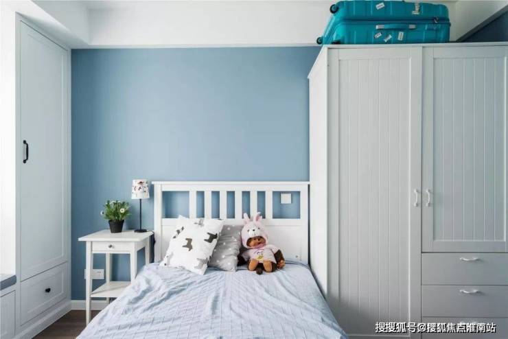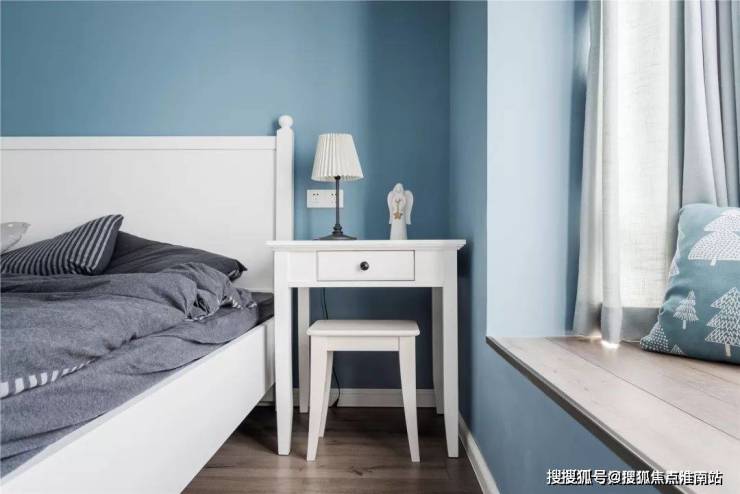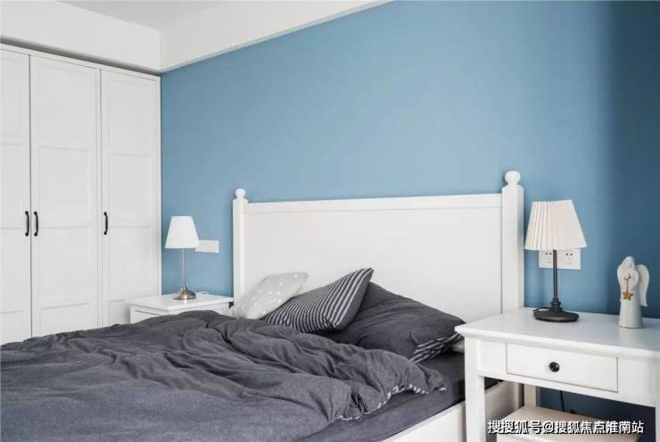 ▲ 浅蓝的墙面营造了清新基调,加以白色的家具进行搭配,赋予了主卧空间简单明快的休憩氛围。