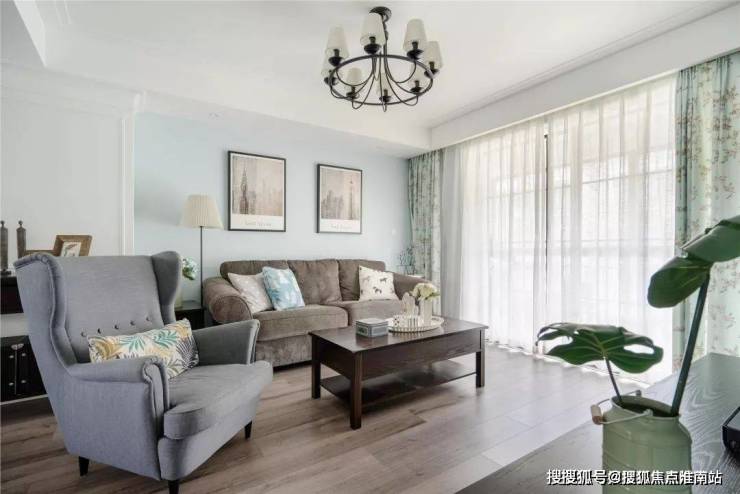 ▲ 浅蓝色的沙发墙搭配素朴的软装,窗边是一款浅绿色的碎花窗帘,整体营造了恬静优雅的客厅氛围。龙珠公寓