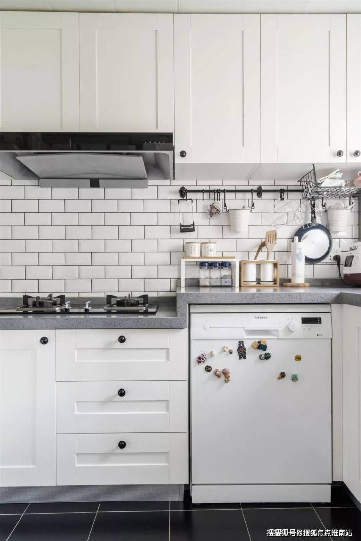 ▲ 厨房墙面的小白砖和白色橱柜,搭配黑色的地砖,显得时髦又大方。而墙面的挂钩架和嵌入式的厨电收纳,又让厨房空间更具清新整洁感。