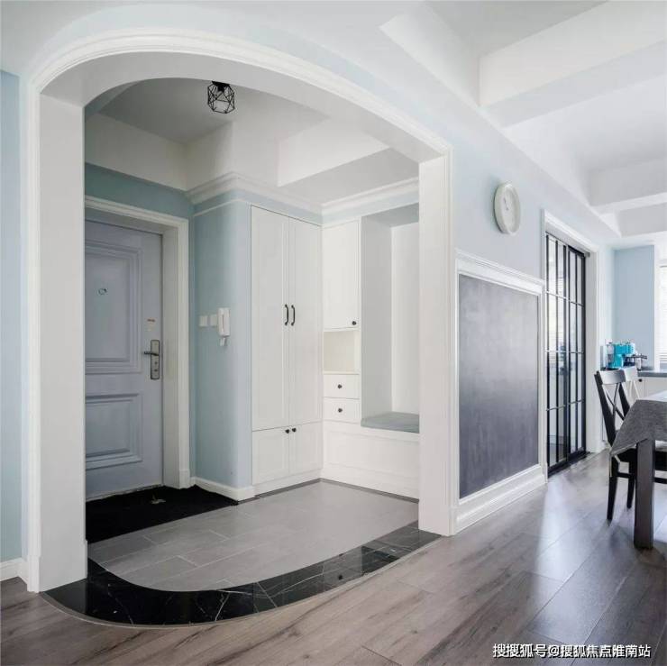 ▲ 浅蓝色墙面采用了护墙板设计,配合墙面三幅简约黑白装饰画,轻快大方的优雅感十足。龙珠公寓