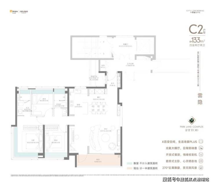 大尺度:四开间朝南+豪华主卧的约270°无柱转角飘窗+横跨客厅和次卧的宽面阳台,整个户型的尺度感拉满。