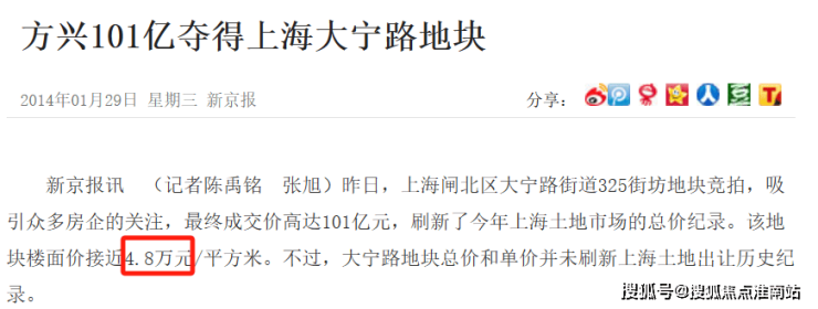 2014年1月土拍,上海闸北大宁地块出让,最终被金茂拿下,楼板价接近4.8万一平,甚至超越了周边的二手房价。