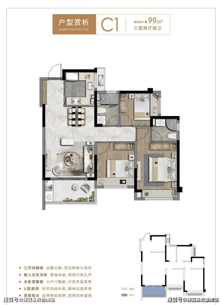 约99平明星户型,舒适3居,南北通透,三开间朝南,全卧室飘窗,超大赠送面积引景入室,还配有嵌入式玄关柜,进阶优选。