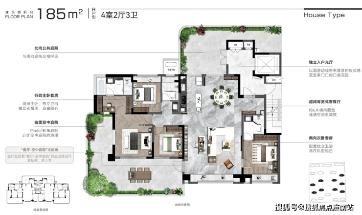 创新曲面转角院落,并实现全户型搭载“客厅-空中庭院”的主动线设计,整体营造立体墅式庭院生活场景。