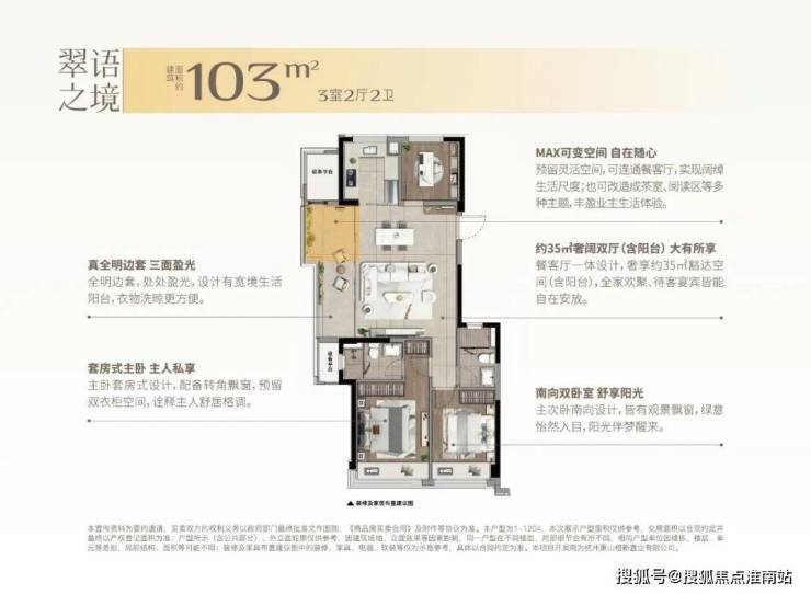 建面约103㎡的边套更是堪称神迹,将小户型的空间魔法玩到了极致。 客厅到阳台的地面、 天花直接拉通, 甚至两侧的墙垛都已隐身, 整个餐客厅面积达到约35㎡(含阳台),这可是140㎡以上大宅才有的空间感!