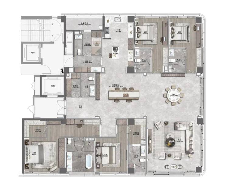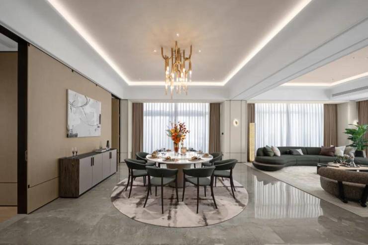 梁志天&上海世尊共同执笔:410㎡湾潮户型:WSD上海世尊团队执笔,以独一无二的“摩登东方”设计语言,抽象提取东方写意精神,与复古摩登、自由艺术平衡相融,领潮钱湾黄金时代。