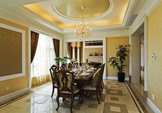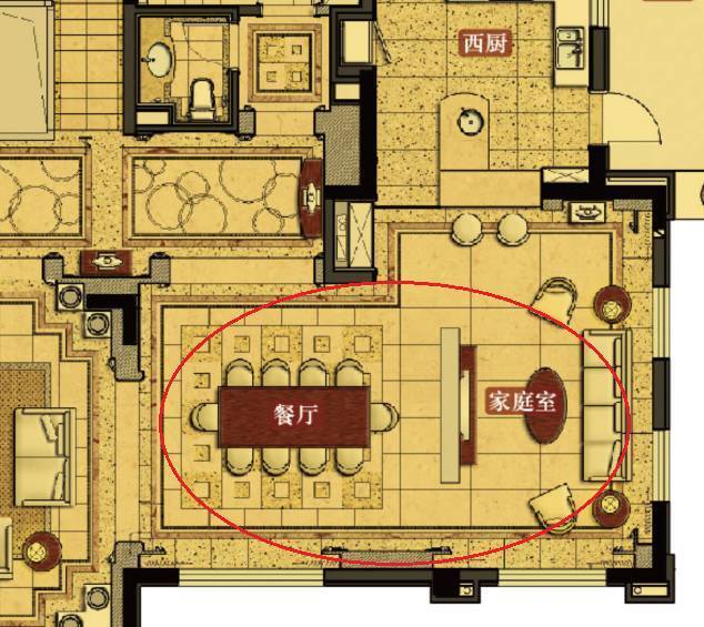 餐厅位于客厅东侧,处东南方位,双面采光,是太阳升起最早照射的地方,也是风水吉位,给人以勃勃生机之感。整个区域面积约45平,面宽约8.6米,进深5米,配20人圆形餐桌仍显阔绰,与其相连的是近20平的家庭休息室,可以放一组沙发配电视柜,在等待用餐时,亲朋或小孩可在此休息聊天。
