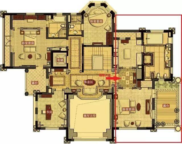 会客室东侧,则是客厅区域,位于该户型中心位置,正朝南,无梁无尖角,面宽6米,不算走廊则进深6米,挑高8米,呈正方形,并配以超大面积的落地玻璃,保持了充足的日照采光,整体显奢华大气。