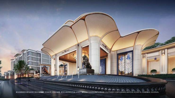 「玉兰门庭」摩登飘逸,环抱式落客前场,大师定制非遗掐丝珐琅门钹,流转温润光华,敬呈归家尊崇礼序,自此启幕生活的华贵序章。