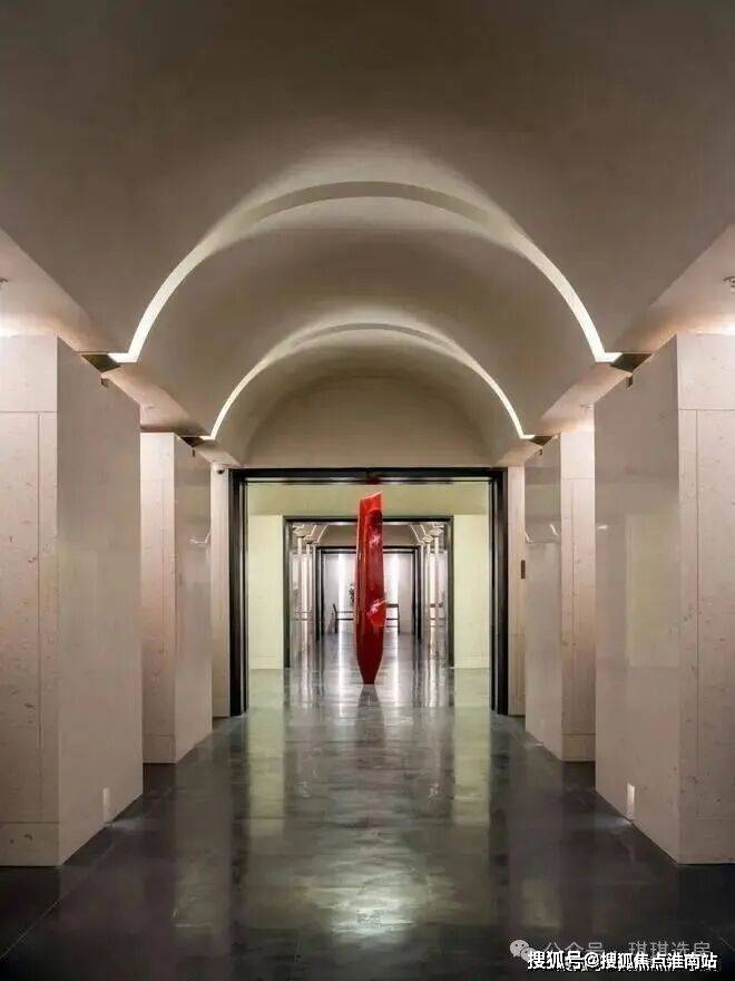 二楼的接待大厅,一尊拔地而起的红色雕塑,其顶部向上挑空到了三层。整个厅堂,都将不定期的进行展品更新,艺术气息浓郁。
