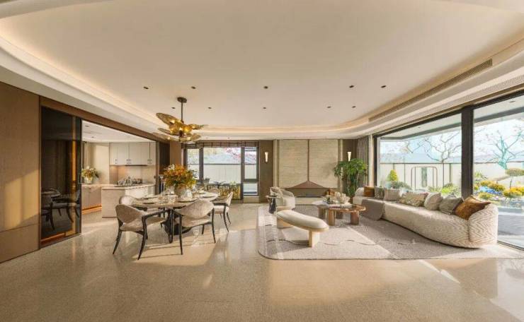 约50㎡巨幕宽厅:家里最显气场的“社交封面”,再看地上。一个约50㎡的巨幕宽厅,直接把大宅的气度拉满。大尺度的面宽和进深,让整个空间通透明亮,阳光和江风都能自由地穿堂而过。