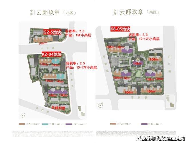 北区容积率2.5,包含G2-5地块和K2-04地块,更靠近地铁站。这两块地由中海在2024年第六批次土拍中以32.1亿元摘得。