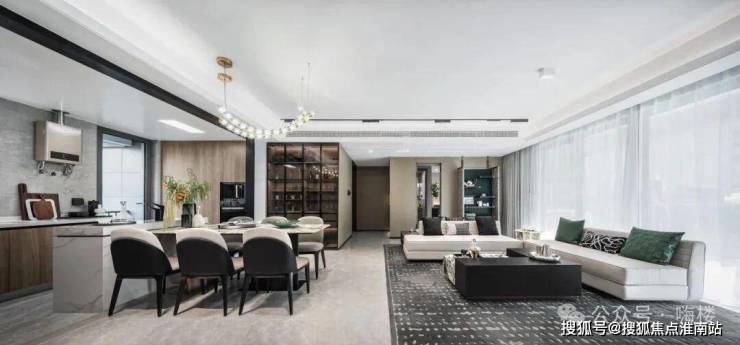 步入LDKB社交会客厅,餐厅、客厅、厨房、阳台融为一体,