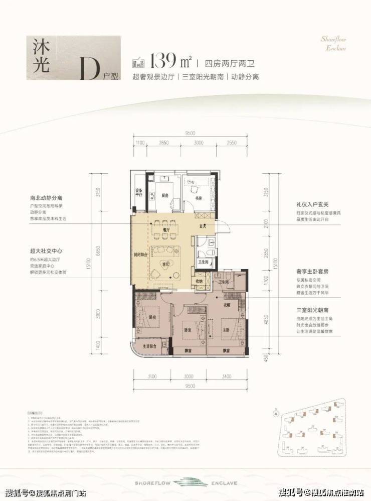 建筑面积约139m²D户型,同样也是四房两厅格局,相比124户型,每套都远离项目南侧主干道,私密性和环境更优,是高净值注重隐私客群的不错选择。南向3面宽,三房朝南阳光充足,家庭成员都有着独立的生活空间。连着约6.5米封闭阳台,可打造多个生活场景。
