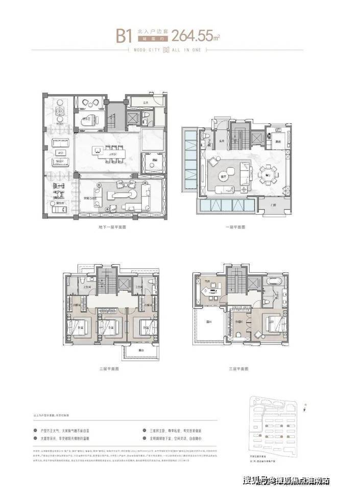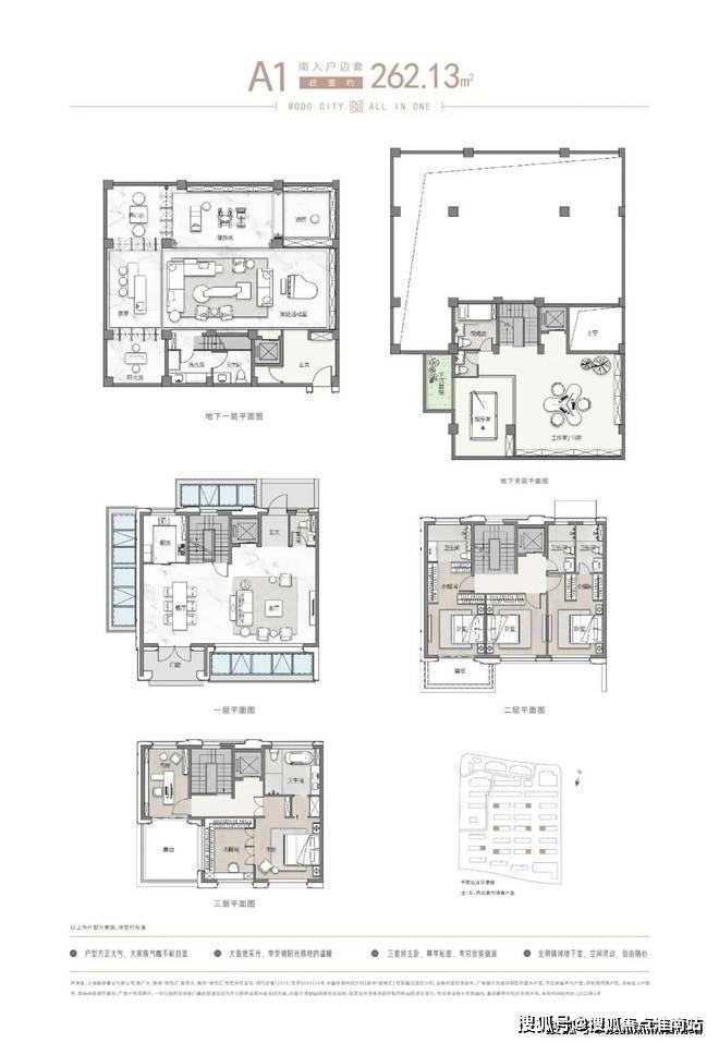 项目主推建面约262-305㎡联排别墅,分为南北入户,均为地上三层,地下两层设计,满足业主们“有天有地有花园”的别墅居住体验!
