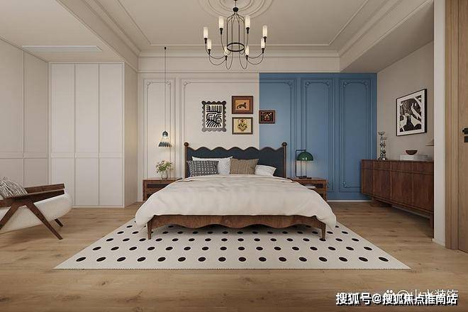 三楼的次卧将配套的阳台扩充进来,增加云朵椅做休闲区,并沿墙面定制顶天接地的高柜,增加储物空间。原户型内凹的不规则区域,正好用来放置实木矮柜,搭配着墙面的复古挂画,耐看且实用。