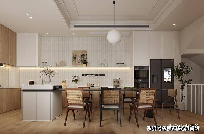 大理石中岛台与实木餐桌采用经典的高低穿插设计,18公分的落差自然划分不同功能区,为日常使用提供便利。洄游动线的布局放大自由度,无论烹饪还是用餐,都拥有更多可能。