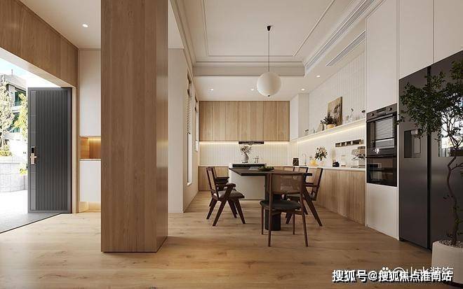 我们拆掉了餐厨之间的非承重结构,做功能融合。保留下来的承重柱,利用木质材料饰面。有序变化的木纹肌理起到视觉延伸的作用,温润的质感多了几分温馨治愈气息。