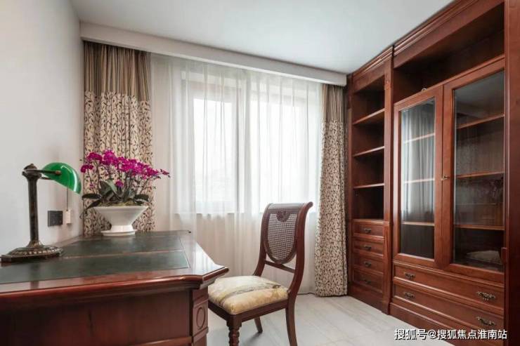 书架、书桌和椅子的选择都经过了精心的考量,以舒适和实用为主导原则,同时巧妙地融入了中式元素。这种设计使得整个空间不仅充满了知识分子的书卷气,更不失生活的雅致与趣味。