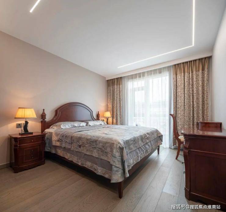 卧室空间巧妙地将舒适氛围与轻奢的华丽优雅相结合,营造出一个既温馨又高雅的休息环境。无主灯的设计巧妙地利用隐藏式光源,避免了刺眼的光线,让整个空间充满柔和的氛围,营造出更加舒适惬意的感觉。在这里,你可以放下一天的疲惫,享受宁静的夜晚,感受家的温馨与宁静。