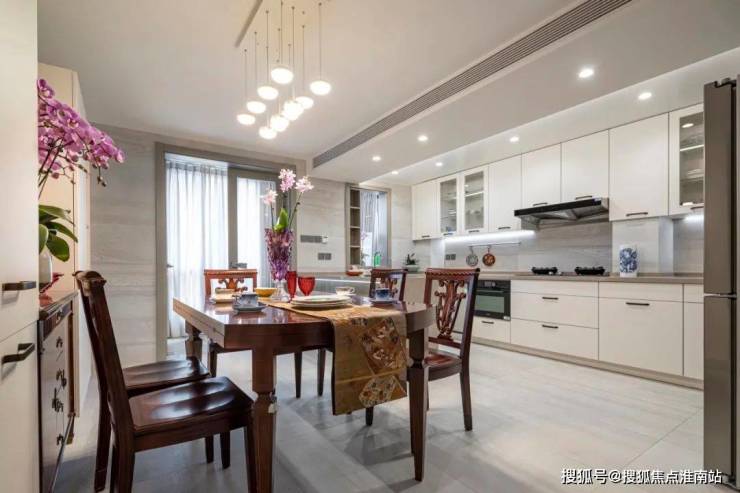 U型厨房空间的设计巧妙地将实用性与美观性融为一体。定制的橱柜不仅耐脏且易于清洁,为厨房的整洁度提供了有力保障。白色的墙砖则为厨房注入了一股清新的气息,使烹饪环境更加宜人。此外,吊柜内嵌的暖色灯带不仅为厨房操作台提供了充足的照明,还营造了一种温馨舒适的氛围,让烹饪过程变得更加轻松愉悦。整个U型厨房空间的设计都充满了人性化的关怀,让人感受到家的温馨与便利。