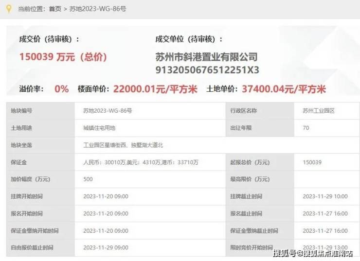 建屋·新棠玥,即苏地2023-WG-86号地块项目,位于工业园区星塘街西、独墅湖大道北,在2023年11月29日由斜港置业以底价150039万元竞得,成交楼面价为22000元/㎡。