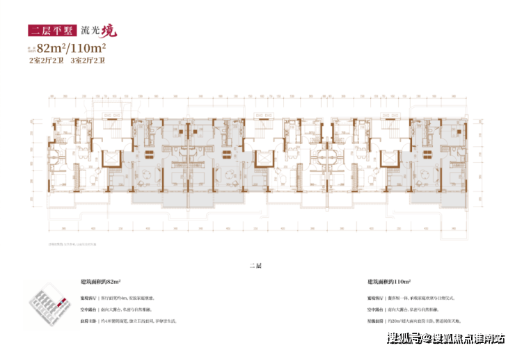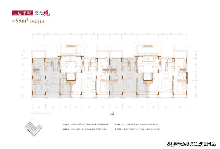 项目主打3层的超低密洋房产品,另有3套联排产品,户型类型丰富;洋房为创新的多层退台式洋房,层高高于传统常规洋房产品,3.3-3.6m层高对标别墅产品层高。