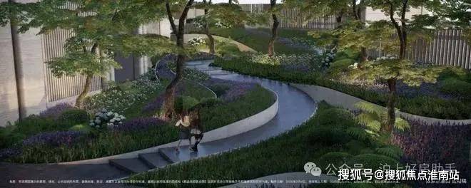 通过景观设计,将小区景打造成了立体台地花园,设置缓坡、下沉式花园、台阶等,让整体景观表现出立体层次感,错落有致。