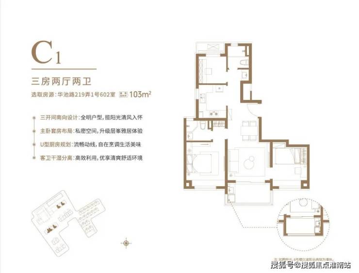 U型厨房的设计、干湿分离的卫浴、套房式的主卧等等。