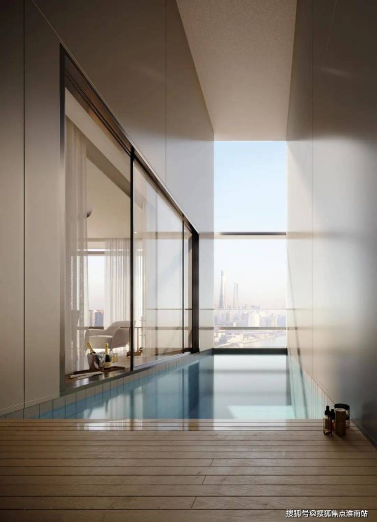景观设计方面,保利世博天悦采用 引江入园、以水带路的手法,将滨江舒阔的国际生活平移到社区内,打造约 6万㎡景观秘境,媲美全球奢华酒店。采用大面积的留白和现代禅意的表现手法,呈现开阔舒展的质感。