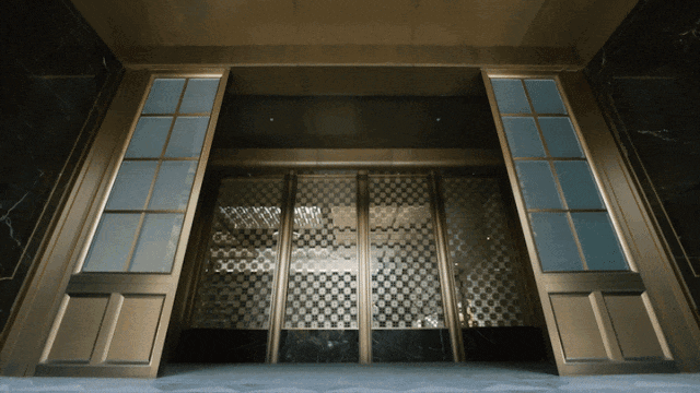 社区门庭由 圣罗兰奢石、白雪公主透光玉石、玉曼米黄大理石,搭配 深咖色定制纹样金属打造,气势磅礴!门庭内 「水韵莲径」架空走廊以石材景墙与金属格栅构成曲径通幽的通道,极具东方韵味~