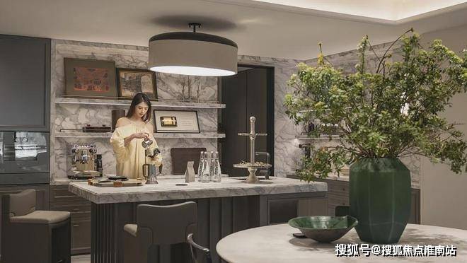 奢雅品质细节:弧形石材壁炉成为空间视觉焦点,定制岛台宛如空间里的艺术装置,巧妙串联厨房与餐桌。中興傲舍一贯的高标准精装也再次延续,石材地面,博世五件套,定制橱柜,实木复合地板等,从材质到工艺,每一处细节都彰显高端品质与精致品味。