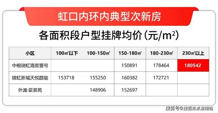 如果把虹口内环内几个典型次新房小区按面积段做细分,你会发现230㎡以上大户型的挂牌价超过18万/㎡,比150㎡以下户型普遍要溢价15%左右。