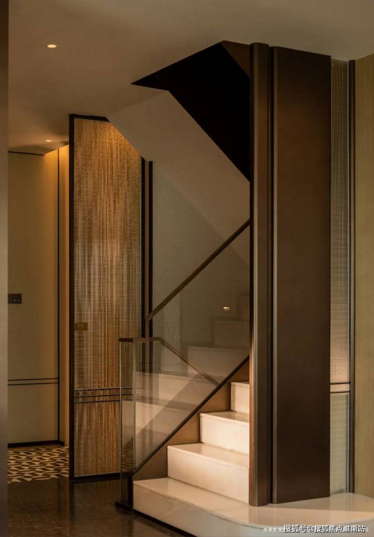 地上楼梯精选的冬日恋歌大理石与皇家白玉踏步相得益彰(仅限建面约200㎡下叠),帕妮丝灰石材与尼斯木饰面交相辉映。
