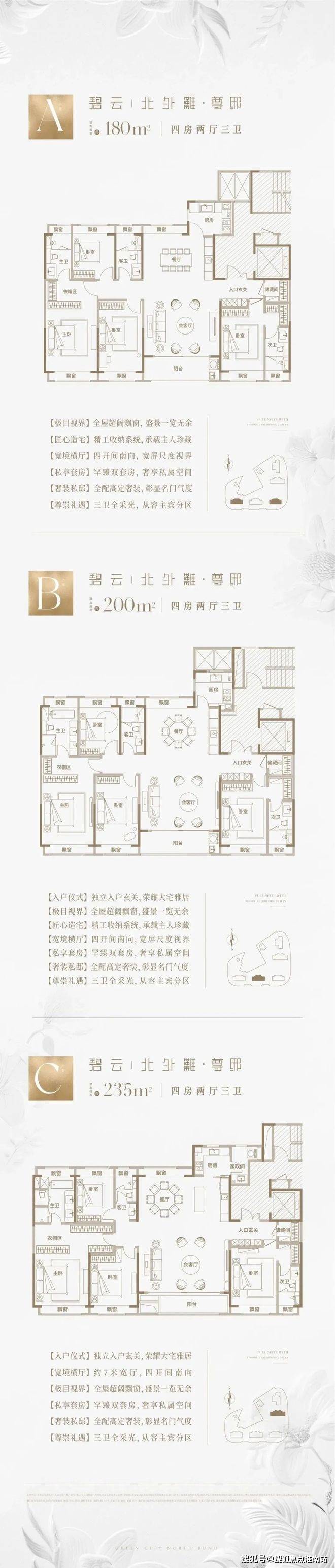 主力户型:建面约180-235㎡四房大平层,采用类一梯一户设计,全屋精装交付14。