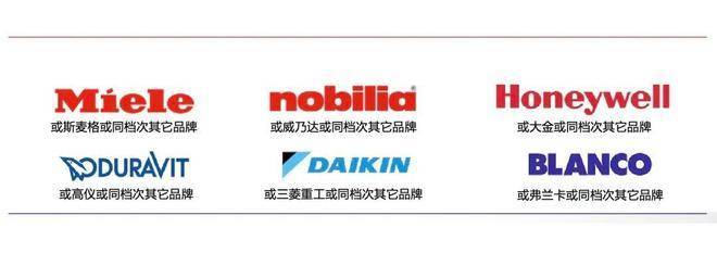 厨电5件套(油烟机、三眼燃气灶、洗碗机、烤箱、冰箱)均采用国际一线大牌美诺或斯麦格;厨房水槽和龙头采用铂浪高或弗兰卡;热水器选用瑞美或能率(或同档次其它品牌);