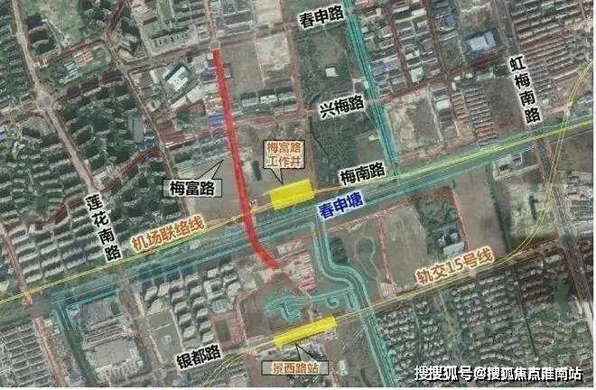 保利置业梅陇项目和15号线隔着一条春申塘,目前项目西侧的梅富路还没有通往对面的桥梁,因此暂时步行到地铁站会比较远,但梅富路桥已经初步设计已完成,未来梅富路将会跨春申塘打通,新建跨春申塘桥。