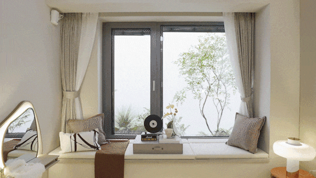 这是宽约12CM的三玻两腔双LOW-E系统外窗,气密性最高达到8级,全方位隔音降噪,关上窗真的有种“与世隔绝”的体验。