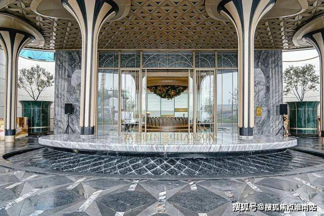 大门口的水景采用了龙鳞水纹的造型。在现场,会有种身处顶奢酒店入户大堂的观感。
