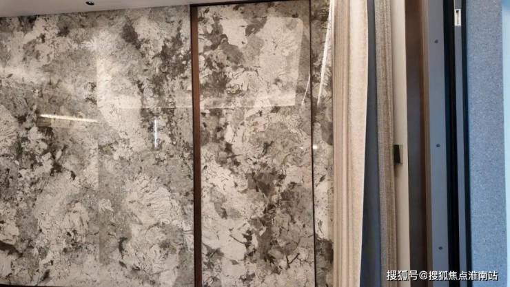 样板间是做了横厅设计,实际交付为4房,这个横厅连同书房面宽约6.9米,仅客厅面宽约为4.2米;电视机背景墙是雪山蓝岩板,也是交付的;室内地面的材质铺装选用1.8米*90公分的大砖密拼而成,几乎看不到缝隙;包含阳台移门在内,所有窗户均为三玻两腔。