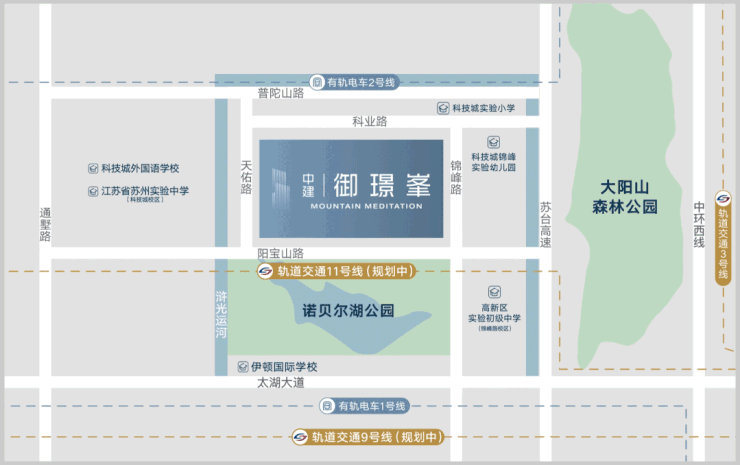 景观配套:国家4A级大阳山国家森林公园、诺贝尔湖公园、恩顾山公园、小茅山公园、彩石湖公园、太湖湿地公园等自然景观环绕。