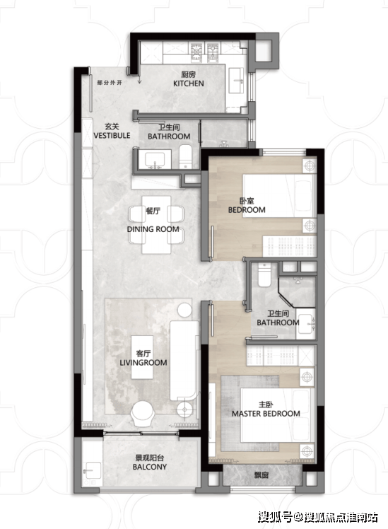 第二个亮点,是 动静分离+客餐厅一体化设计,功能区和休息区互不干扰,客餐厅、厨房等公共活动区集中在一侧,卧室等休息区全部一侧,保证了私密性!