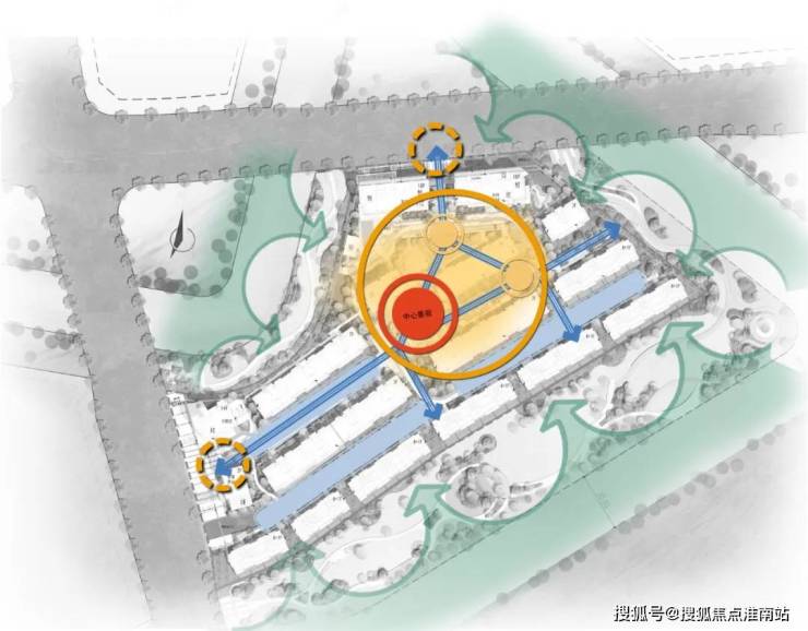 项目总体布局体现为“一环、两轴、三围合”的设计构思。一环”是指连接小区主次入口的主环道以及形成小区中央的大花园,“两轴”是指贯穿小区东西和南北两条相交的主要景观轴线,“三围合”是指小区南侧有50米城市绿化带,东侧和北侧均有20米城市绿化带,三面均被景观绿化带和东侧的长山直河、南侧的官河,北侧的郎家浜河所环绕,自然景观俱佳。