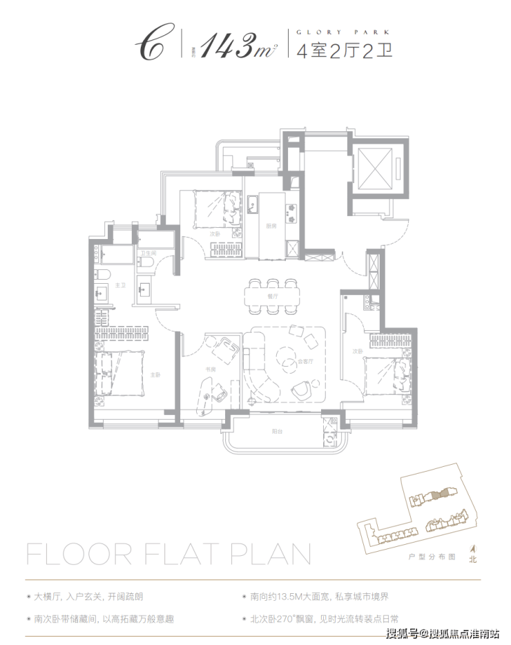 另外,一个优秀户型应该有的设计,包括入户玄关、3间卧室带飘窗、约270度采光面的阳台、卫浴干湿分离...这个户型全部具备。