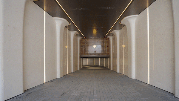 门庭延街的立面以弧形米色石材+老虎玉大理石+古铜色艺术灯具 构筑贵雅气质,环岛空间的奢石镶嵌与对称美学,再现百年海派风华。