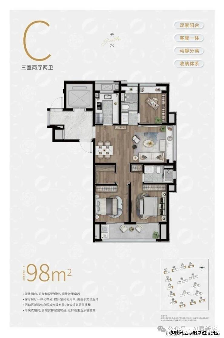 C户型:建面约98㎡3房2厅2卫▼陆家嘴.锦绣云澜售楼处电话:400-8567-334✔✔