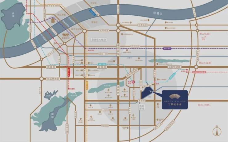 中国・杭州・萧山区新塘街道萧绍东路与新城路交叉口西侧 100 米(南站新城核心区,三面环水半岛形制,距地铁 5 号线双桥站约 500 米,距火车南站约 1km,近彩虹快速路、通城快速路)