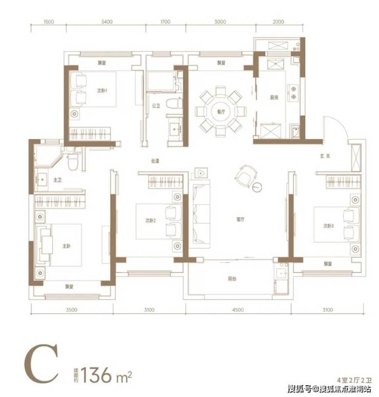 建面约136㎡客厅宽达 4.5米,主卧宽 3.5米,次房间分别达 3.1米、 3.4米,独立餐厅,靠窗南北通透。